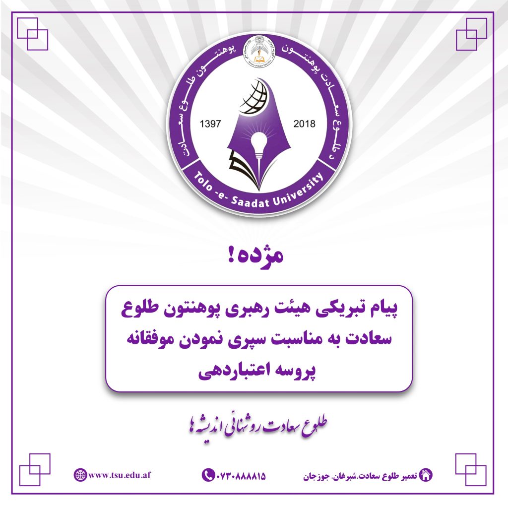 - پوهنتون طلوع سعادت با کمال مسرت و افتخار اعلام میدارد که بر بنیاد ارزیابی مسلکی هیئت محترم بازنگر و مکتوب رسمی ریاست محترم تضمین کیفیت و اعتباردهی وزارت محترم تحصیلات عالی، این نهاد علمی موفق گردیده با کسب ٪۷۹.۵۱ مرحله اول پروسه اعتباردهی یا تضمین کیفیت را با موفقیت سپری نماید.