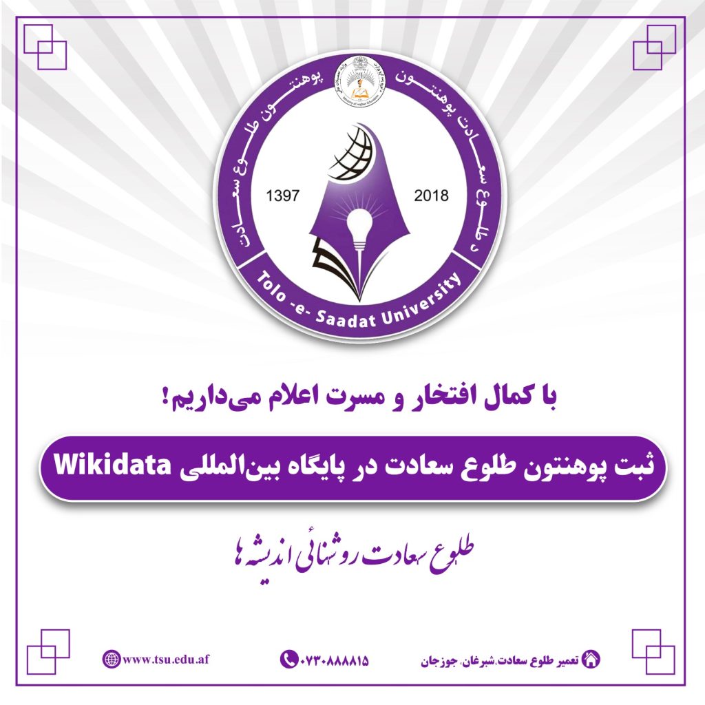 پوهنتون طلوع سعادت (TSU)، بهعنوان یک نهاد علمی–اکادمیک پویا و متعهد به معیارهای نوین تحصیلات عالی، با شناسه یکتای Q138767204 در پایگاه داده ساختارمند و بینالمللی Wikidata به ثبت رسیده است.
